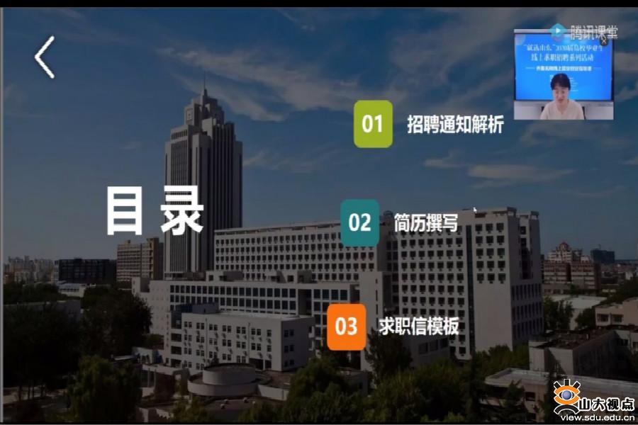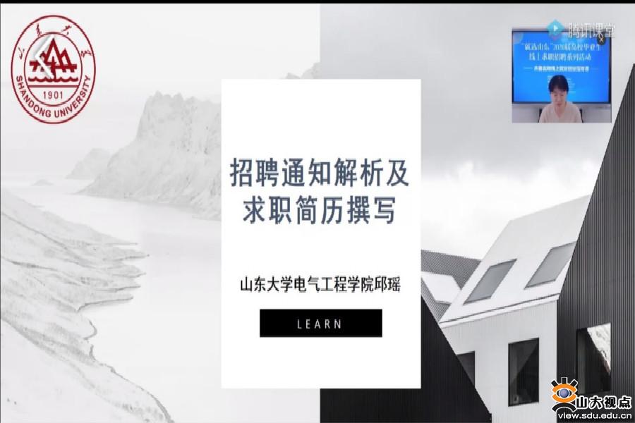 [本站讯]4月17日,第七期齐鲁名师线上就业指导课举行。本次课程由电气学院团委书记邱瑶主讲,通过腾讯课堂App进行直播授课,向广大应届毕业生讲解如何解析招聘通知以及如何撰写求职简历。