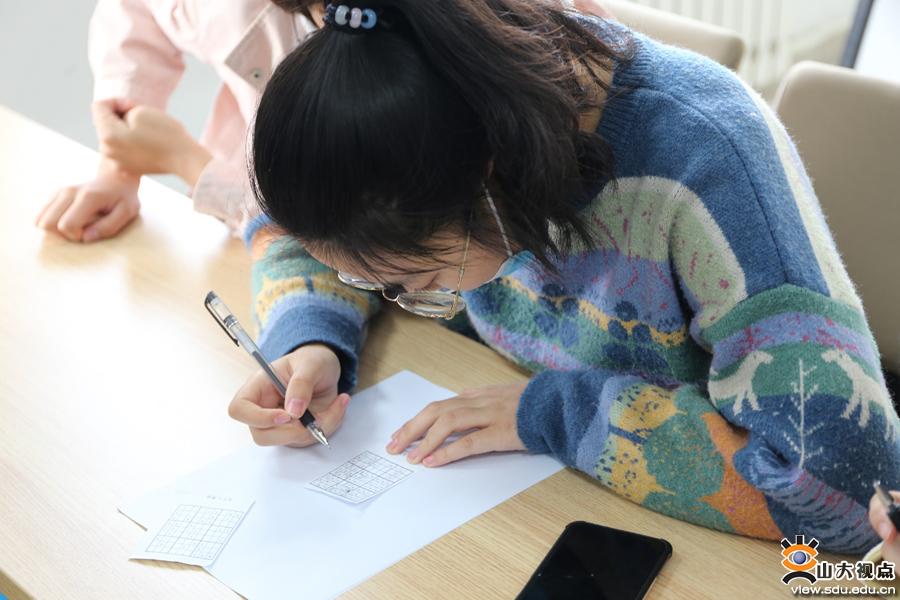 数独是源自18世纪瑞士的一种运用纸笔进行演算的逻辑数学游戏。活动现场通过分发试题的形式进行作答,通过盘面上已知的数字,推理出所有剩余空格的数字,并满足每一行、每一列、每一个粗线宫内的数字均与对应数字不重复,每张题纸有四个等级的题目,参与同学根据作答完成等级兑换礼物。