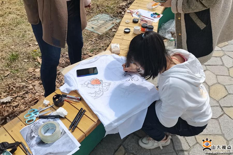 众人齐心好颜色,文化衫上展胸臆。在“炫彩文化衫”涂鸦活动中,同学们借助颜料在白T恤上自由创作,绘画出独一无二的T恤。有人用颜料浸湿调色盘,拧起衣服扎染;有人先在T恤上画了图案,再用颜料上色;有人直接将丙烯颜料涂在手上,在T恤上盖下五颜六色的手印,同学们将自己的奇思妙想和丰富的内心世界展现出来。此次活动丰富了同学们的大学生活,也对同学们的艺术素养、美育培养起到了促进作用。