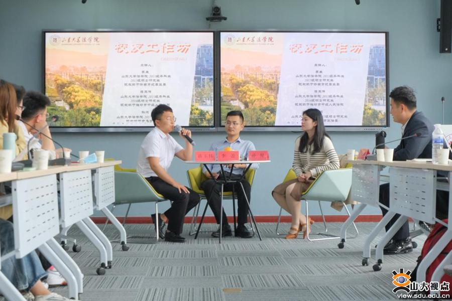 活动伊始,孙悦、蒋玉伟、李盖三位校友围绕本期主题依次向在座同学分享了选调生的备考经历与个人基层工作历程。孙悦围绕着定向选调生的选拔条件与流程、培养方案、备考过程中的心得体会以及入职之后的基层生活等方面展开了详细介绍,启发在座同学要以明确的职业目标为导向,有针对性地进行就业准备。蒋玉伟讲述了个人的职业选择心路、山东省专额定项选调的趋势、选调生笔试与面试准备的方案技巧,全面分享了个人的基层挂职经历与心得,结合扶贫攻坚与环境整治工作,向同学们展现了投身于基层工作的选调生之独特风采,激励同学们在实现角色转变的过程中不忘初心,在与群众的相处中担当使命,在工作岗位中保持学习习惯,在人际交往中秉持和而不同的心态。李盖结合个人择业经历,鼓励同学们根据个人职业兴趣进行职业选择,根据未来职业规划进行针对性实习,根据个人条件对职业岗位进行精准划向,在备考问题上,李盖强调要进行全面、系统、有计划性的准备,最后,他还就个人基层工作经历与心路历程向在座同学进行了分享,启发同学们在择业过程中注重以自信、勤奋、踏实的心态制胜。