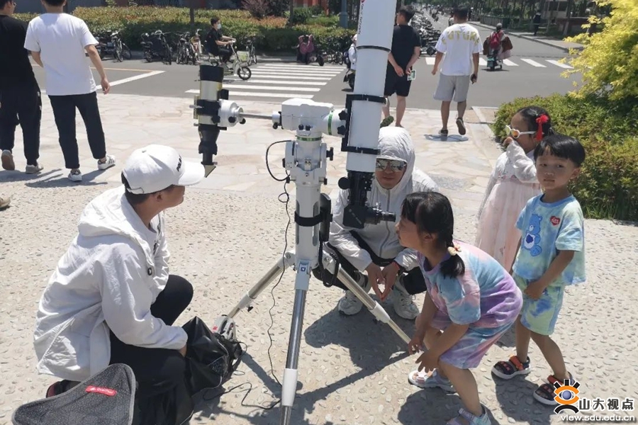 上午10时,路边天文观测活动在校区田径场外小广场开展。山东大学空间科学研究院科普团队与山东大学(青岛)天文协会会员同学顶着烈日架起两台望远镜,分别开展太阳光球与色球观测,并指导协会会员及校区师生观测、拍摄了太阳黑子与日珥活动现象,耐心解答了活动参加者关于安全观测太阳的方法、黑子与日珥成因、太阳活动对地球的影响、极光的形成与观测地选择等诸多有关“空间天气”的问题。现场还发放了《空间天气与人类活动》宣传册及由研究院师生拍摄的极光明信片,活动取得良好效果。