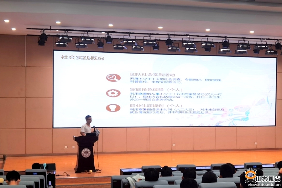 活动伊始,社会实践优秀个人依次进行经验分享。许金壮同学从社会实践概况、组队、实践过程、活动宣传、注意事项五个方面总结了经验,同时向大家介绍了社会实践的选题原则与方向,提出衡量选题优劣的原则,包括现实性、可行性和创新性;焦静雨同学结合自己参加社会实践的经历,介绍了社会实践活动的前期准备工作、具体实践过程、新闻与推文撰写等社会实践的主题框架和丰富内容,帮助大家对社会实践流程有了更清晰的概念。