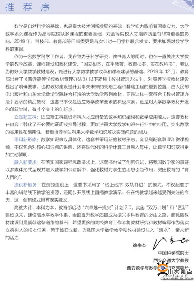 教材由山东大学副校长刘建亚、吴臻担任丛书顾问委员会总顾问和顾问,数学学院院长陈增敬担任丛书编委会主任,张天德教授担任主编,中国科学院院士、教育部高等学校大学数学课程教学指导委员会主任委员徐宗本作序推荐。本套教材按照教育部2019年底印发的《普通高等学校教材管理办法》以及大学数学教指委对数学教学改革的要求编写,突出了课程思政的基本要素,优化了内容结构,支持线上线下混合式教学。教材对目前高校数学公共课的教学模式创新、教学案例设计、教学资源建设、课程思政建设等各个重要方面均能起到较好的支撑和参考作用,为我国高校数学一流课程建设及公共课教研改革发挥积极推动作用。