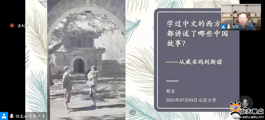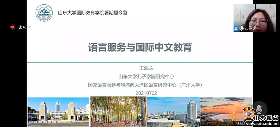 7月3日全天,学院为营员们精心准备了两场学术讲座。山东大学孔子学院研究中心研究员、加拿大兰加拉学院亚洲研究系程龙教授,以“西方的中文学习者都讲述了什么样的中国故事?——从威妥玛到斯诺夫妇”为题,结合大量珍贵的影像资料,介绍了自清朝末期来华的西方人威妥玛、斯诺夫妇等以照片、游记等形式讲述的中国故事。特别是斯诺夫妇记录下的早期共产党领导人、延安军民的“红色故事”对于西方社会正确认识中国共产党产生了重要作用。他指出,作为汉语教师,特别是在海外的汉语教师,应该注重结合个人的视角、采取不同的表现形式、从中外文化交流的角度讲述中国的故事。程龙教授广阔的学术视野、个人的学术经历和海外丰富的跨文化传播的实践也带给同学们诸多启发。山东大学校友、广州大学人文学院/国家语言服务与粤港澳大湾区语言研究中心王海兰副教授以“语言服务与国际中文教育”为题,从国际中文教育的内涵与外延、国际中文教育的发展形势、语言服务视角下的国际中文教育三个方面讲述,一一解读其内涵,深入浅出,使同学们从不同视角了解了国际中文教育情况。在互动环节,授课专家对同学们的提问做了耐心细致的解答。王海兰副教授的讲座同时也揭开了山东大学国际教育学院百廿校庆“校友谈”系列学术讲座的帷幕。