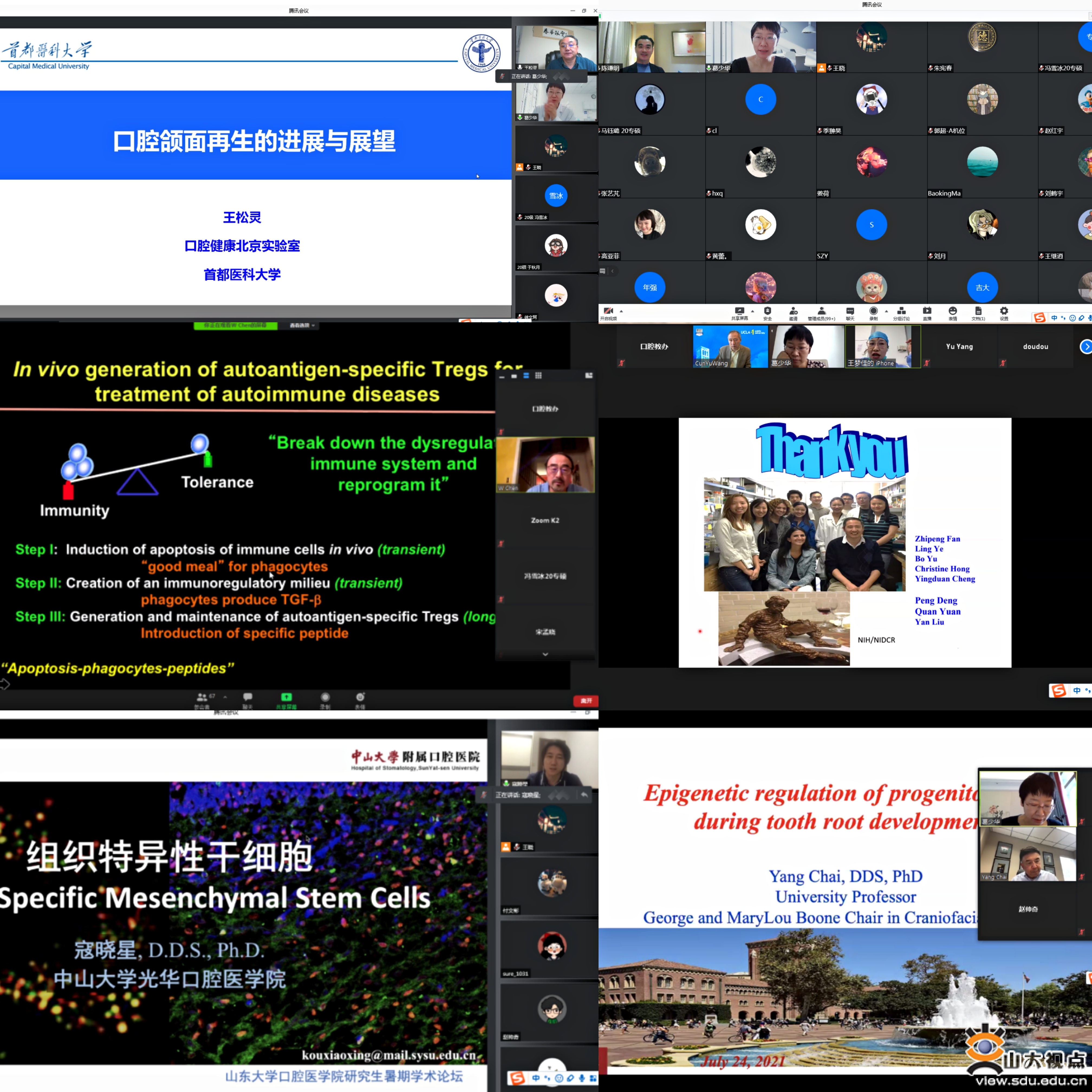 中国科学院院士王松灵教授介绍了口腔颌面再生的现状与展望,美国南加州大学Herman Ostrow口腔医学院副院长柴洋教授、美国加州大学洛杉矶分校牙学院副院长王存玉教授、美国国立卫生研究院NIDCR粘膜免疫学室主任陈万军教授、中山大学附属口腔医学院寇晓星教授分别作了关于“Epigenetic Regulation of Stem Cells During Tooth Root Development”“Epigenetic Control of Skeletal Aging”“Tissue Specific Mesenchymal Stem Cells”“Regulatory T cells in Immune Responses and Diseases”的专题讲座,浙江大学医学院附属口腔医院院长陈谦明教授就口腔临床发热疾病辨析策略进行了深入浅出的讲解和分享。山东大学校友、上海交通大学医学院附属第九人民医院孙树洋教授、张善勇教授就“头颈部恶性肿瘤个性化药物研发及临床合作研究”和“颞下颌关节紊乱病-正畸-正颌联合诊治模式的选择和实践”进行了深入探讨。
