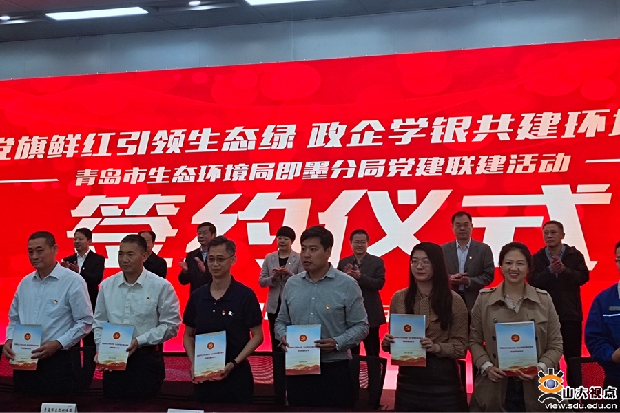 青岛市生态环境局即墨分局副局长章维主持仪式。仪式上,青岛市生态环境局即墨分局局长王海刚宣读了《党建联建方案》。山东大学环境学院机关党支部书记李紫薇代表环境学院机关党支部签约《党建联建协议书》。