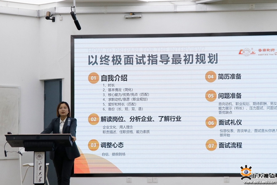讲座中,宋祥云介绍了鲁南制药集团的岗位招聘情况,并让同学们自由表达对该岗位招聘要求的理解。她表示,面试需要明确目标,掌握应聘核心,以达到招聘要求,否则很难面试成功。同时,明确目标又包含理清岗位要求和个人要求。在选择目标岗位时要以人岗合一为最终指向,因为在面试过程中,每个问题都是与岗位相关的,重点是考察人岗是否匹配。宋祥云展示了目前医药相关岗位,包括研发类、销售类、生产类、职能类。她表示,职能类是比较适合新传学子的岗位。随后,宋祥云对大家制作简历进行了指导,她介绍了简历组成信息,强调教育背景的填写应该遵循3W+倒叙原则,并说明了简历中应该注明的其他要素,包括获奖情况、个人技能、兴趣爱好、个人评价四个方面。她强调,制作简历不可马虎粗心,要认真对待简历信息,这是企业招聘的第一道关卡。她还对终极面试进行了指导规划,她表示,自我介绍时要突出自我的核心能力,一定要讲面试动机;简历要准备备份,防止面试现场的突发情况;如果要应聘外企则需要双语简历,并准备好外语口语面试;求职意愿一定要明确,了解自己和企业的适配程度,是想做长期还是短期,自己想从企业获得些什么,等等。