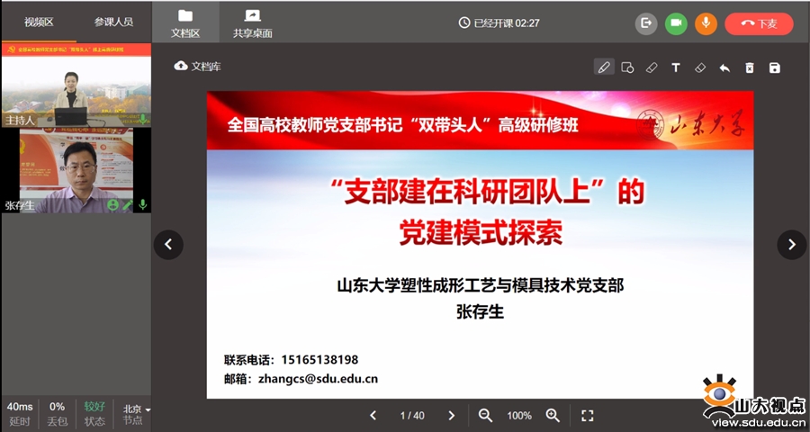 [本站讯]近日,由教育部思政司主办、华中师范大学全国党员教育培训示范基地承办的2021年全国高校教师党支部书记“双带头人”线上高级研修班举行,来自全国201所高校的“双带头人”教师党支部书记参加培训。山东大学材料学院模具所教工党支部书记张存生应邀在培训班上作“支部建在科研团队上的党建模式探索”的报告。