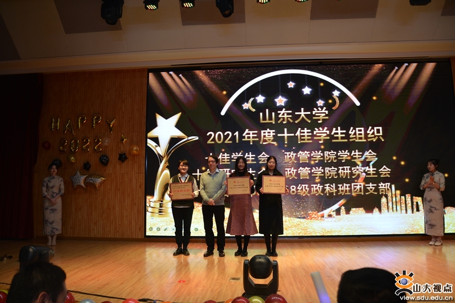 开场节目结束后,2021年度优秀学生表彰大会正式开始。2021年度政管学院充分发挥学科底蕴、人才资源、文化内涵等独特优势,紧紧围绕“为党育人、为国育才”的初心使命,紧扣立德树人根本任务,深入推动学生德智体美劳全面发展,育人成效显著,学生在学术创新、社会实践、志愿服务、学生工作、文体赛事等方面屡获佳绩,荣获包括全国挑战杯课外学术科技作品竞赛红色专项二等奖在内的多项国家级、省级、校级高层次成果奖项。本次表彰大会上,校十佳学生会、校十佳研究生会、校十佳团支部、校先进班集体和优良学风班、院先进班集体、校级先进团支部、院级青年大学习先进班团支部和优秀团支部、国家奖学金、校长奖学金、道德风尚奖、山东省研究生优秀成果奖等荣誉获奖代表依次上台领奖。优秀学生表彰大会是政管学院榜样育人工程的重要内容之一,旨在充分发挥榜样的引领作用,鼓励学院更多的学生爱国、励志、求真、力行,对标先进努力成为最优秀的自己。