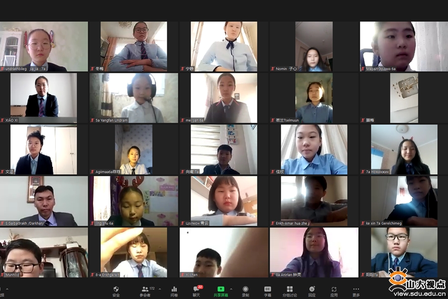 蒙古国立大学孔子学院中方院长朱军利,蒙古国有关学校人员;国际教育学院项目管理办公室、拓展办公室、对外汉语教学部有关人员,项目授课教师、助教以及全体学员参加开营仪式。接下来,山东大学承办的十余个“汉语桥”线上团组交流项目也将陆续启动实施。