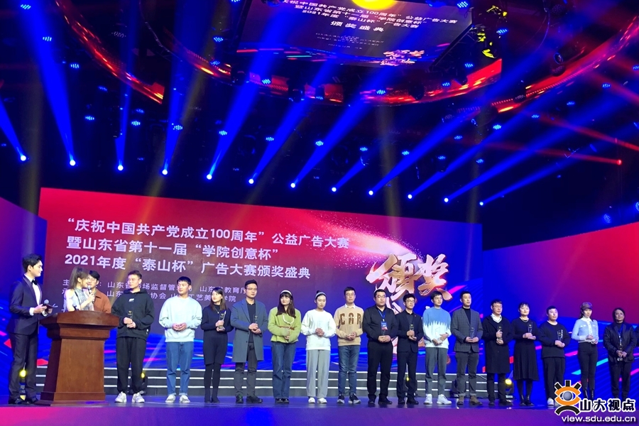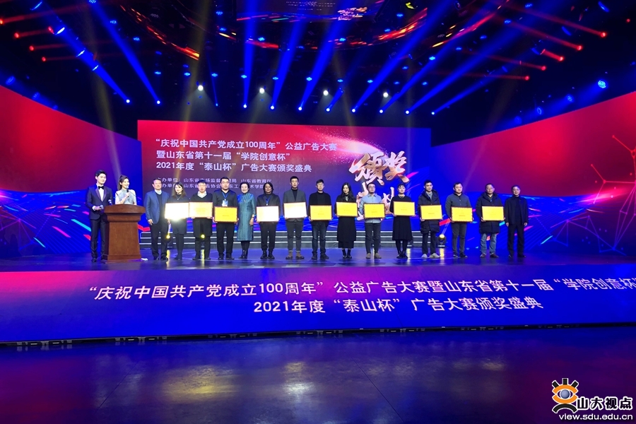 [本站讯]近日,“庆祝中国共产党成立100周年”公益广告大赛暨山东省第十一届“学院创意杯”、2021年度“泰山杯”广告大赛颁奖典礼在山东教育电视台演播大厅举行。艺术学院师生在本次比赛中取得优异成绩,共16位同学获奖,其中,2019级本科生王思悦荣获“泰山杯”广告大赛金奖,2018级本科生张凯荣获“学院创意杯”银奖,2019级研究生王堃燕荣获“庆祝中国共产党成立100周年”公益广告大赛铜奖,山东大学荣获此次广告大赛最佳组织院校奖。