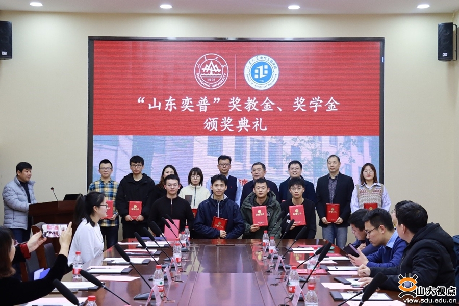 在“山东奕普”奖教金、奖学金颁奖环节,电气学院副院长杨明宣读《“山东奕普”奖教金、奖学金获奖名单》,胡喆和刘相宜共同为获奖者颁发证书。