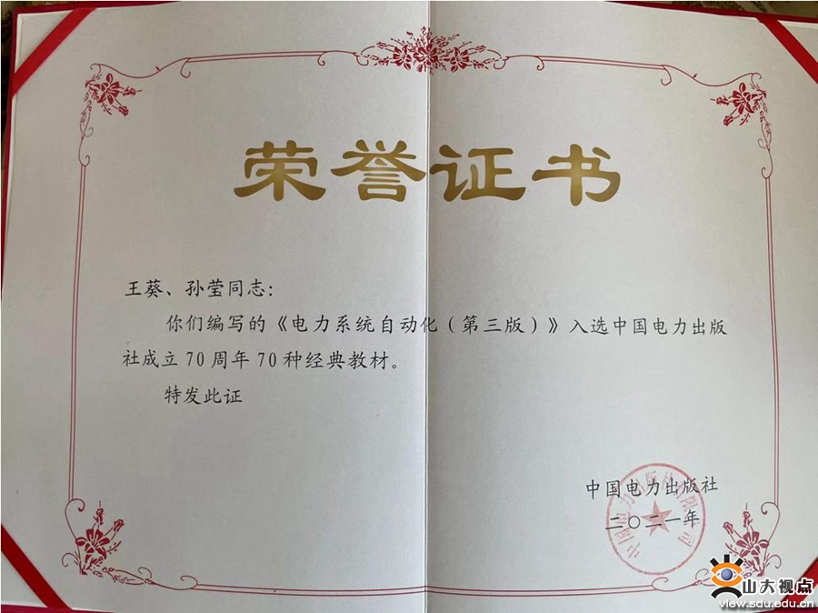 [本站讯]近日,中国电力出版社颁发了出版社成立70周年经典教材证书,电气学院王葵、孙莹编著的《电力系统自动化(第三版)》入选中国电力出版社成立70周年70种经典教材。
