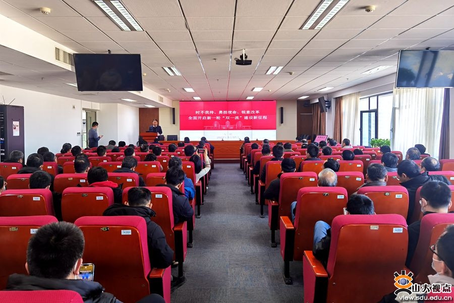院长万熠代表学院班子以“时不我待、勇担使命、锐意改革,全面开启新一轮‘双一流’建设”为题向全院教职工作总结报告。他首先传达了校长樊丽明在新一届中层领导班子上岗培训中的专题报告精神,介绍了学校“十三五”期间和“十四五”开局所取得的系列成就,解读了《山东大学“十四五”事业发展规划》《山东大学世界一流大学建设方案(2021-2025)》主旨纲要和学校新一轮“双一流”建设的战略部署。随后,他全面总结了学院2021年度在人才培养、科学研究、学科建设与规划、国际交流与合作、实验室建设、服务社会、在职教育等方面的主要工作和成效,分析了新形势、新起点、新要求下学院发展所面临的机遇和挑战,并逐条对标学校KPI关键指标和领导班子任期目标责任书,认真查找不足、明确重点、补强短板。他表示,希望全院教职工以时不我待、勇担使命、锐意改革的决心,共同全面开启新一轮“双一流”建设新征程,奋力书写学院高质量发展新篇章。