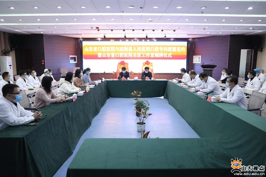 山东大学口腔医院与疏勒县人民医院签订口腔专科联盟协议并成立山东大学口腔名医工作室,旨在通过远程会诊、技术帮扶、定期不定期巡诊等方式不断强化疏勒县人民医院口腔学科内涵建设、学科建设和人才队伍建设。