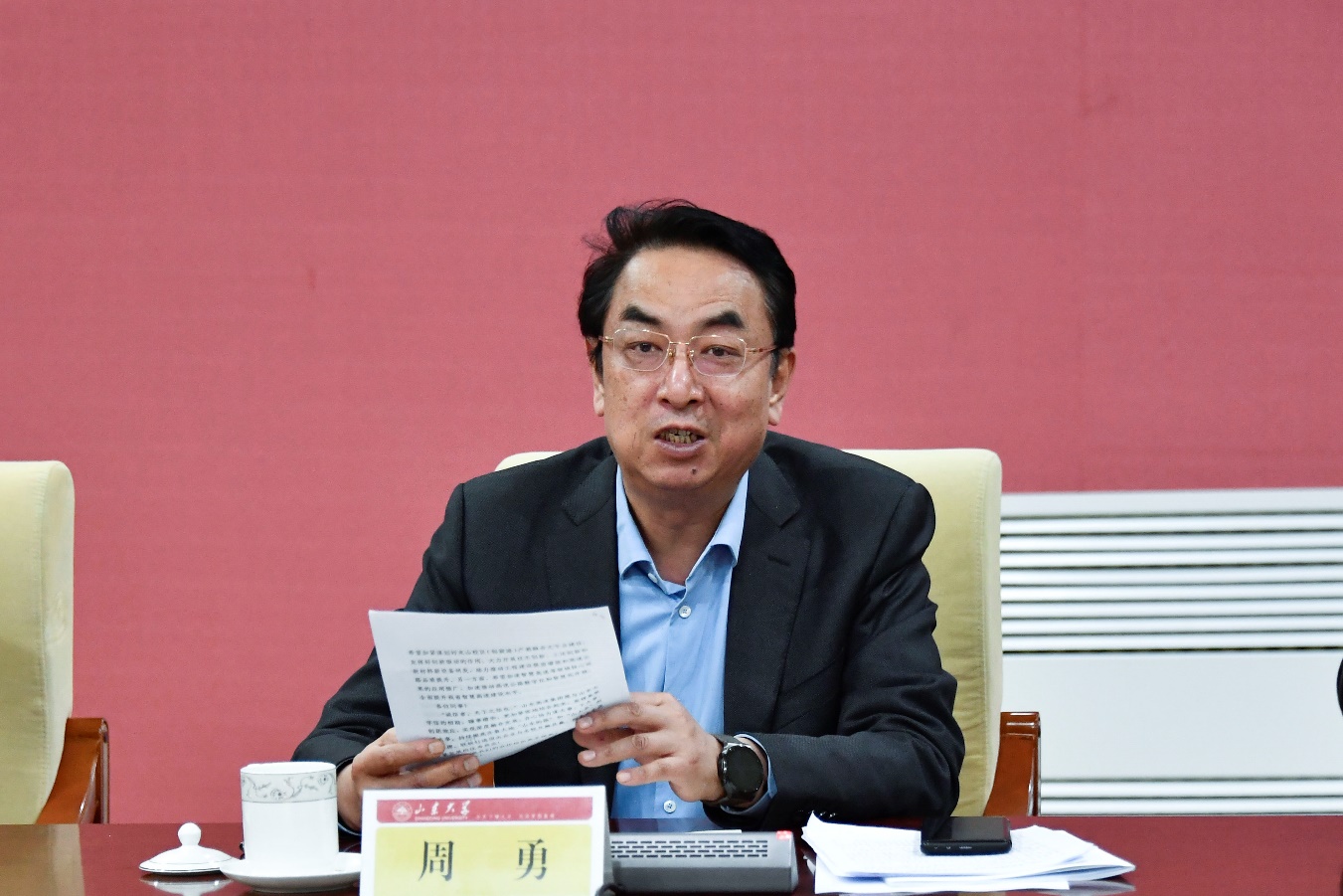 周勇在讲话中指出,齐鲁交通学院秉承开放办学的初心,凝聚了强大的师资和科研力量,为山东大学建设世界一流大学和一流交通学科提供了稳定支持,为山东高速集团科研水平提升和高新技术产业开拓提供了有力的支撑。双方聚焦交通领域科技前沿,结合山东工程建设和产业发展需要,在各领域开展了全面深入合作与交流,取得了令人欣喜的成绩。他强调,“十四五”时期,是交通强省建设的关键阶段,集团在服务新时代现代化强省建设中将展现更大担当,希望学院加紧谋划好龙山校区(创新港)产教融合大平台建设,发挥好创新驱动的作用,大力开展关键核心技术研发与成果转化,统筹配置资源、资本、技术、产业优势,加速推动我省高速公路数字化和智慧化提升。他表示,山东高速集团将进一步集聚资源、资本、技术、产业优势,统筹配置人才培养保障条件,大力支持学院发展,集团愿与山东大学齐心协力联袂打造顶尖企业与名校互融共赢、服务山东高质量发展的优秀典范。