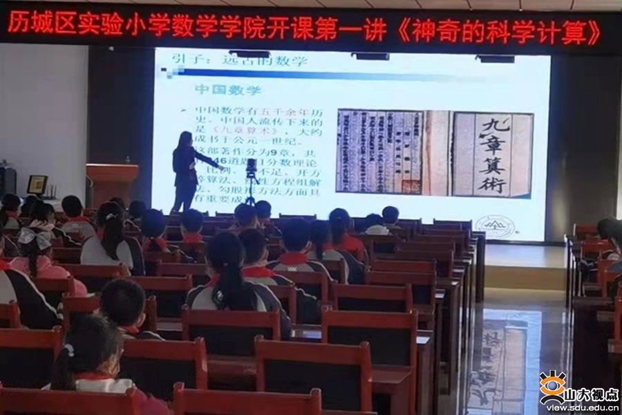 以科学普及为延伸,打造数学文化新名片。学院深入贯彻落实学校服务山东发展战略,积极践行“扎根齐鲁大地创建一流学科”的发展理念,结合学科特点,聚焦基础教育,把满足山东基础教育的迫切需求作为工作出发点和落脚点,积极助力山东基础教育高质量发展,实现了校地同频共振、合作共赢。数学文化节期间,数学学院与历城实验小学开展科学普及活动,刘蕴贤教授以“神奇的科学计算”为题,讲述了数学的发展以及科学计算在航空航天、天体运行等方面的应用,同时倡导科学精神、普及科技前沿,进一步激发了学生的科学研究兴趣和热情。