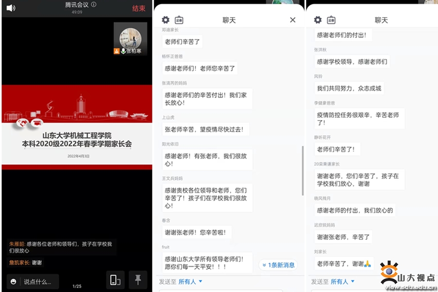 各年级辅导员以“筑牢战‘疫’防线,安全学习请放心”“做好服务保障,日常生活可安心”“密切家校共育,学生发展齐用心”为主题,重点围绕线上远程教学、严控人员进出、全面核酸检测、定期消杀检查、从严管理物流等方面介绍了学校采取的有力防控措施;细致沟通了校园内各项服务保障,并倡议家长加强与学生沟通的交流、引导学生树立理性平和的乐观心态、及时沟通解决实际困难,家校一起努力为学生成长发展保驾护航。
