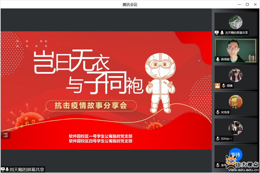 [本站讯]4月17日晚,软件学院疫情防控学生临时党支部通过腾讯会议线上平台联合举行“岂曰无衣 与子同袍”疫情防控故事分享会,本次会议由软件学院学生党员先锋促进会宣传部刘天赐主持,旨在挖掘身边的防疫故事,分享战疫力量,树立防疫工作先进典型,弘扬奉献、友爱、互助、进步的志愿者精神。支部全体成员参加会议。