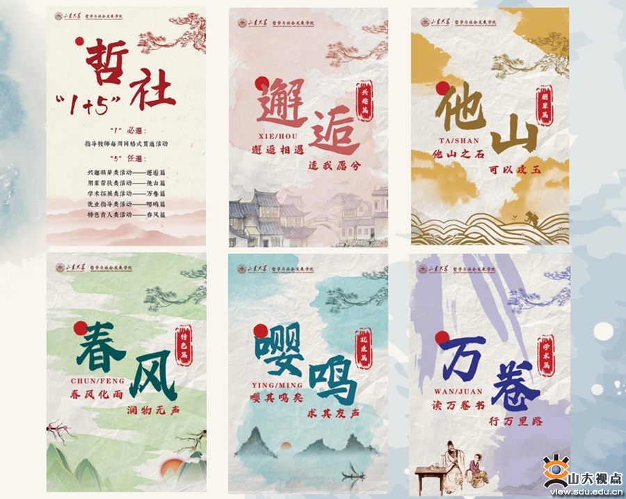 内外联动,构建三全育人新格局。一是指导教师网格化,一周一次,一生一策。学院依托“本科生导师制”开展关爱学生活动,发挥好本科生导师立德树人和学术引领作用。未分配导师的班级,学生在班级内部自由组建10人小组,确保每个小组由一名学院教师负责,每周以小组为单位组织一次集体活动。二是品牌活动清单化,一级一品,一横一纵。结合不同年级学生需要,学生教育培养活动按照“1+5”与“必选+任选”模式开展,1为指导教师网格贯通式每周集体活动,5为邂逅篇、他山篇、万卷篇、嘤鸣篇和春风篇五个横向版块,涉及兴趣萌芽、朋辈辅导、学术拓展、就业指导、特色育人等,每位同学每周除参与小组活动外,可在5个选修版块限选不少于1个项目参与学习。