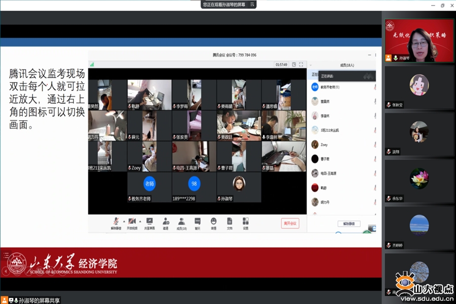 孙淑琴首先对线上授课以来学院教师们的辛苦付出表达感谢,提出当前要在做好疫情防控工作的前提下,扎实推进教学和科研工作,营造风清气正的考试氛围,确保无纸化考试顺利开展,切实完成本学期各项教学任务。随后,她向大家详细演示了网页版雨课堂试卷编辑、在线监考、试卷批阅的具体操作,并针对教师在雨课堂操作方面的疑惑之处进行了详细解答和补充说明。会议强调,期末考试是学院教学工作的重中之重,全体教师应提高认识,确保线上考试各环节严格按照统一要求进行,维护考试的严肃与公平公正,同时任课教师需提前提醒考生考试注意事项,并对考生做好诚信考试教育。经济学院全体教师及来自机械、软件等学院共80多位教师参加了本次会议。