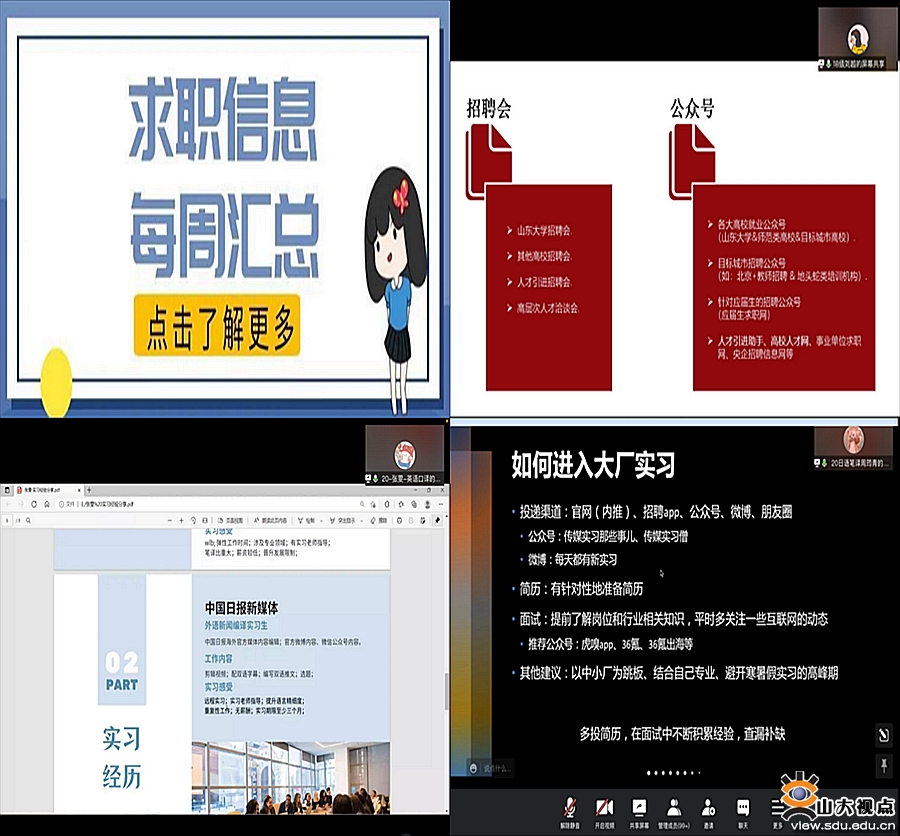 实习就业创未来。面临当前疫情挑战,外国语学院高度重视就业工作,主动谋划,开展内容丰富、形式多样的就业指导活动,多维度为毕业生提供更广阔的择业空间。为满足同学们的线上面试等个性化需求,学院统筹协调现有教室、教师办公室、会议室等场所,避免时间和空间冲突造成的相互影响,并举办职业生涯规划经验分享会、第九届学生职业生涯规划大赛等活动,针对毕业就业季的来临拟举办就业经验分享会、面试讲座等有助于研究生发展的各项讲座和分享活动,此外每周定时更新实习及招聘信息汇总,不断加强就业指导、思想引领、跟踪服务、精准帮扶的温度和力度,助力学生更加充分、更高质量就业。