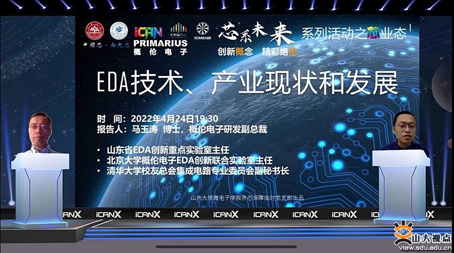 [本站讯]为引导学生了解半导体行业发展现状和就业市场需求,丰富学生文化活动,4月25日,微电子学院芯系未来系列活动第四期如期在线上开展。本期活动邀请了上海概伦电子股份有限公司研发副总裁、山东省EDA创新重点实验室主任马玉涛博士为同学们带来了题为“EDA技术、产业现状和发展”的讲座,讲座由微电子学院党委书记吴天柱主持。