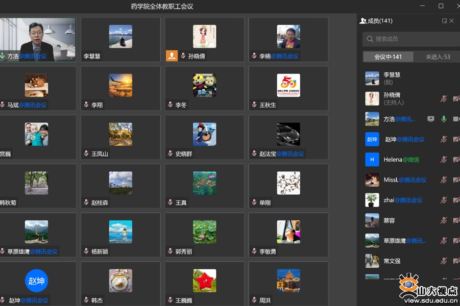 [本站讯]4月28日晚,学院召开线上全院教职工大会,传达疫情防控有关要求,对“树师德 正师风”专项活动进行动员,并对药学院“十四五”规划建设和“临床医学与重大疾病”双一流学科药学支撑学科建设方案及考核指标进行学习和部署。学院领导班子成员出席会议,全体教职工参加会议。会议由常务副院长方浩主持。