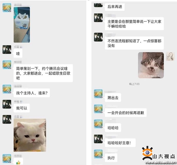 下午5时,辅导员宋石猛开始与班委商议为叶文馨庆祝生日的具体流程和有关事项。在将叶文馨移出群聊后,生活委员牛凝将庆生计划发在微信群中,同学们保持默契,相互告知,并提前进入了会议室,明确各自分工。