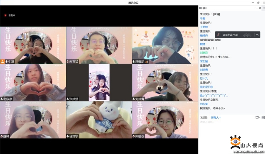 [本站讯]“祝小馨生日快乐!”掌声和欢笑在“云”会议室此起彼伏。5月2日,既是新闻传播学院2018级本科生叶文馨的22岁生日,也是大家入住长清区城西隔离点的第二天。这一天,新闻传播学院师生在“云”会议室进行祝福语接力,共同为叶文馨同学庆祝生日。
