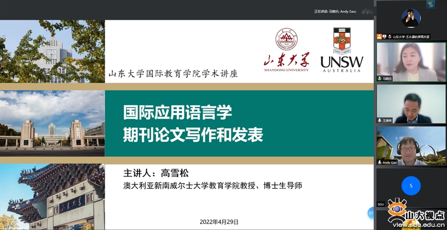 [本站讯]4月29日下午,国际教育学院举办境外专家流动岗专题讲座,邀请澳大利亚新南威尔士大学教授、国际青年应用语言学者联盟理事长高雪松担任主讲嘉宾,讲座题目为“国际应用语言学期刊论文写作和发表”。院长马晓乐、学院和校内外200余名师生参加讲座,副院长王彦伟主持讲座。