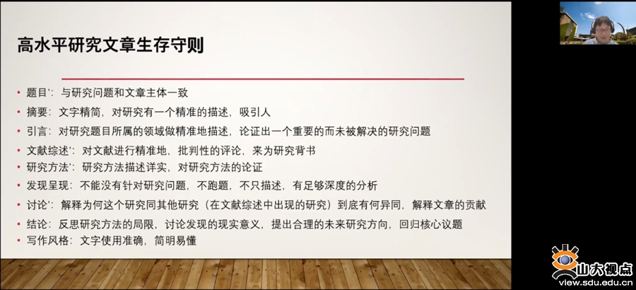 讲座中,高雪松基于自身发表、编审论文的经验,分析了三个方面具有重要性和基本性的问题,一是各个学科领域定义性质的书籍、旗帜性期刊和大型国际会议的重要性,二是文献阅读和论文撰写中研究者研究方向、论文引言与摘要体例格式的重要性,三是以教育学领域知名期刊为例在期刊特点和选稿用稿倾向方面的重要性。随后就如何选题、定量研究、质性研究、高水平文章写作等几个方面,全面介绍了国际应用语言学期刊论文写作和发表的机制与流程。
