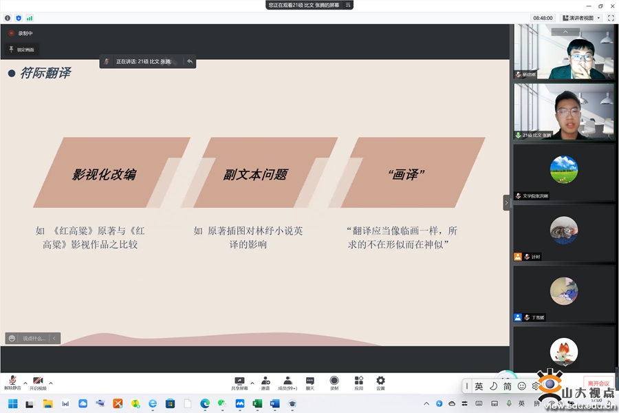 [本站讯]4月30日,文学院举办第四届研究生学年论文报告会暨一等奖候选终评会。报告会采用腾讯会议的形式召开。研究生院副院长郎剑锋、培养办主任许峰,外国语学院副院长马文、文化传播学院常务副院长张红军,文学院学位评定分委员会委员张树铮、刘林、程相占、李剑锋、黄发有、孙学堂、李开军、马兵,导师代表丛新强、吴柱,以及2020级、2021级全体研究生参加报告会。文学院副院长杨建刚主持报告会。