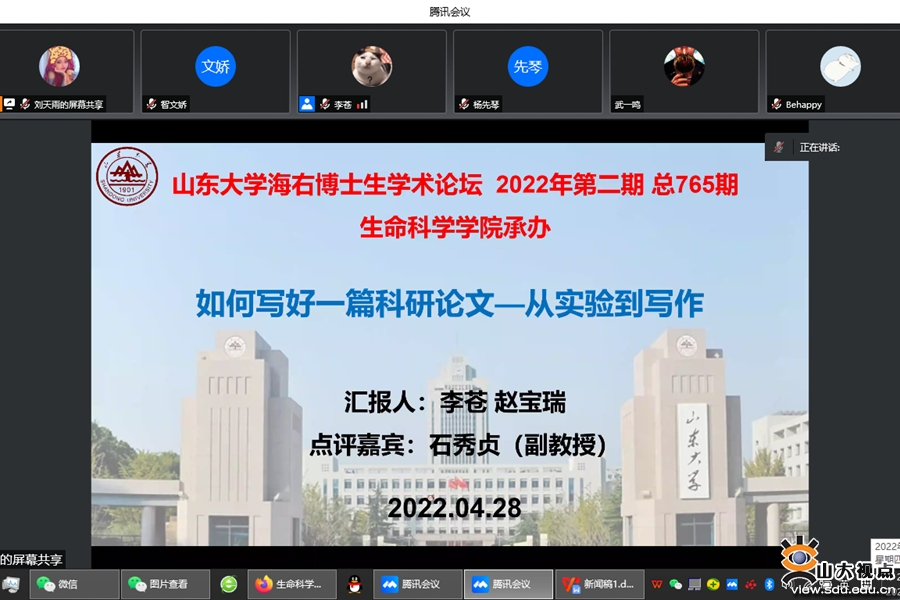 [本站讯]4月28日,由山东大学研究生院、党委研究生工作部主办,生命科学学院承办的2022年第2期(总764期)研究生学术活动“海右”博士生论坛于青岛校区举行。生命科学学院博士研究生李苍和赵宝瑞担任主讲人,石秀贞老师作为点评嘉宾出席论坛。