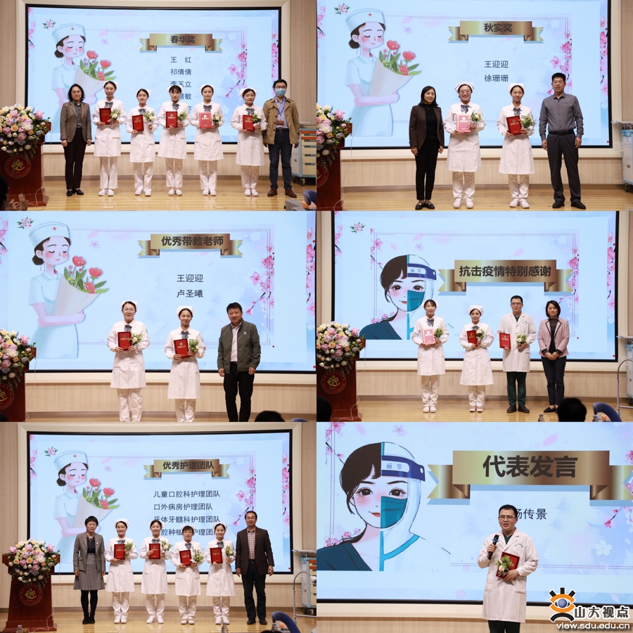 本次大会共设“春华奖”“秋实奖”“优秀带教老师”“优秀护理团队”4个奖项,对王红等9名护理人员及儿童口腔科等4个护理团队进行了表彰;为宁玉君等3名护理人员颁发了“疫情防控感谢状”;杨传景代表参与济南市疫情防控集中隔离点志愿服务的护理人员作发言。