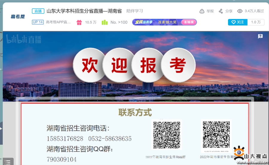 直播宣讲中,王宪华详细介绍了山东大学人才培养优势与特色,分析了2022年湖南省招生情况、咨询渠道与报考建议等,解答了有关国家级一流专业、中外合作办学、转专业、报考等问题。本次直播宣讲,受到众多考生关注,直播间累计观看量达3.4万人次,是截至发稿前所有场次中数据最高的。