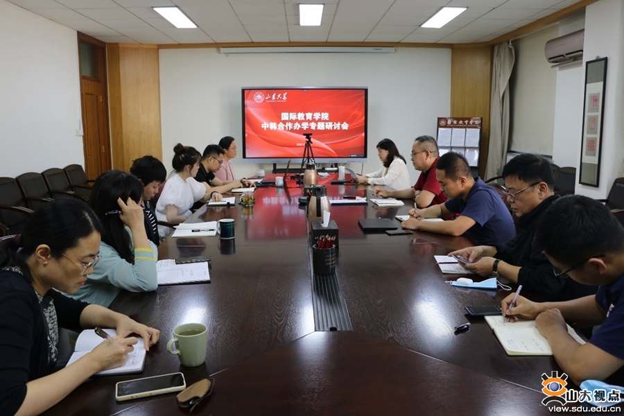 [本站讯]5月30日下午,国际教育学院在综合楼召开深化中韩合作办学专题研讨会。学院领导班子成员、有关科室和系部负责人参加研讨,威海校区国际合作交流处高绍山作专题报告。研讨会由学院院长马晓乐主持。