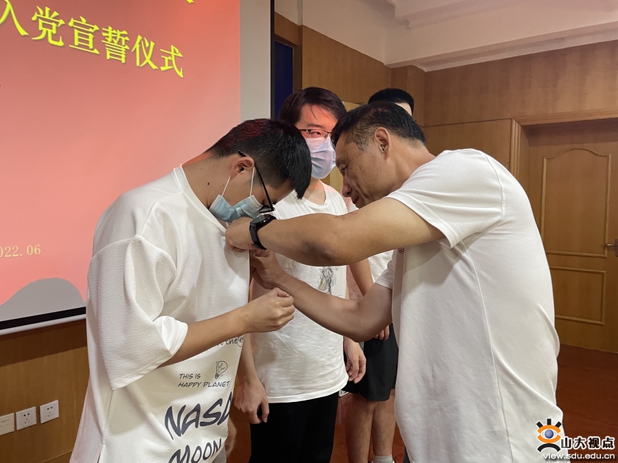 党徽授戴及入党宣誓仪式上,中心主任、党总支书记马金耀为新党员代表戴上党徽,并给予谆谆嘱咐。党总支委员“一对一”指导新党员正确佩戴党徽。之后,全体党员在中心副主任、党总支纪律统战委员王伟副教授的带领下,面向党旗,高举右拳,庄严宣誓。仪式现场气氛庄重热烈,全体新老党员共同接受了一次全面的党性教育和心灵的洗礼。