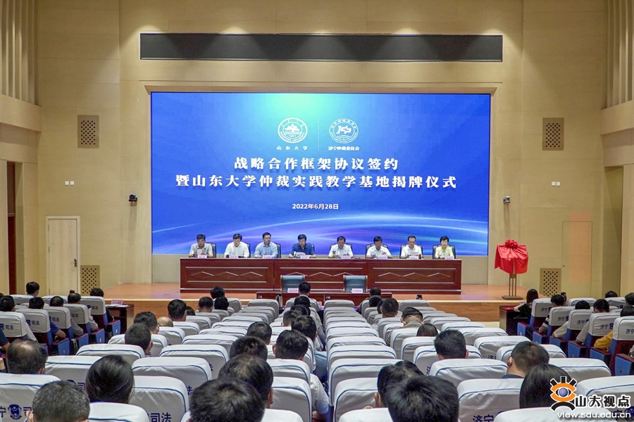 [本站讯]6月28日,山东大学与济宁仲裁委员会战略合作框架协议签约暨山东大学仲裁实践教学基地揭牌仪式举行。济宁市副市长、市公安局党委书记、局长、济宁仲裁委员会主任李海洋,山东大学校长助理、青岛校区党工委常务副书记邢占军出席仪式。仪式由济宁市仲裁委员会办公室党组书记、主任狄峻青主持。