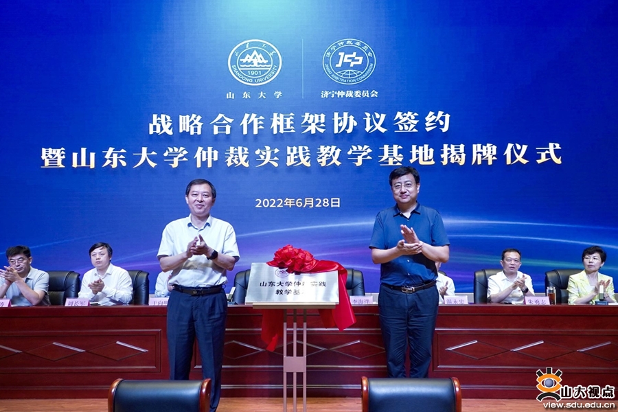 仪式上,邢占军、李海洋为“山东大学仲裁实践教学基地”揭牌;山东大学法学院院长周长军,狄峻青代表双方签订了战略合作框架协议。山东大学与济宁仲裁委员会战略合作框架的签署和山东大学仲裁实践教学基地的建立,有助于双方在科研合作、人才交流、业务培训等方面深度融合,实现优势互补,共建共赢。法学院将立足学科特色,深化供需对接,构建与法学学科专业密切结合的市场拓展工作体系,围绕仲裁开展学生实习实践,拓展新的学生就业渠道。