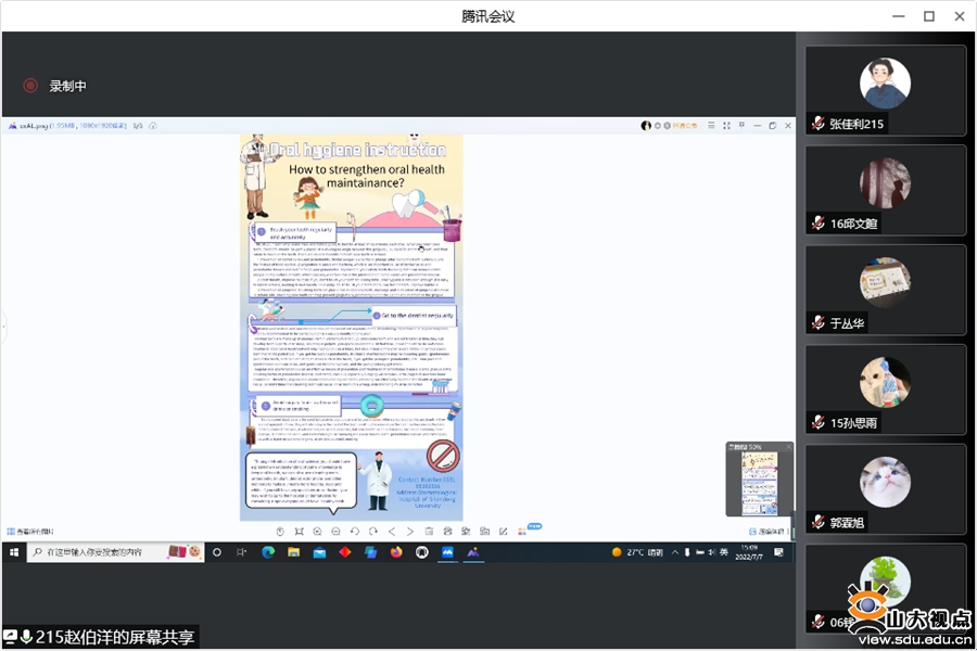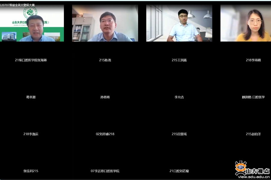 [本站讯]近日,口腔医学院(口腔医院)首届全英文口腔科普壁报展示大赛通过线上方式举办。学院(医院)副院长郭杰等领导班子成员出席活动,活动邀请同济大学口腔医学院党委副书记孙瑶教授,山东大学基础医学院副院长邹永新教授,口腔医学院(口腔医院)副研究员、种植科医师杜密担任比赛评委。活动由郭杰主持。