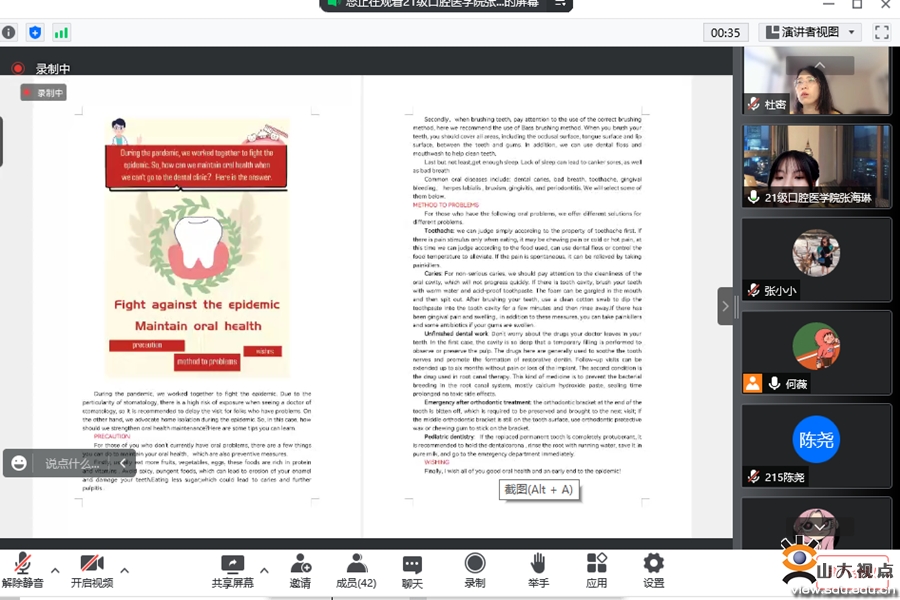 本次大赛主题为“疫情下如何加强口腔健康维护”,设立一、二、三等奖,优秀奖,最佳创意奖,最佳版面设计奖和最佳文字叙述奖五类奖项。来自学院(医院)2021级口腔医学专业的37名本科生进行了壁报展示与全英文讲解。