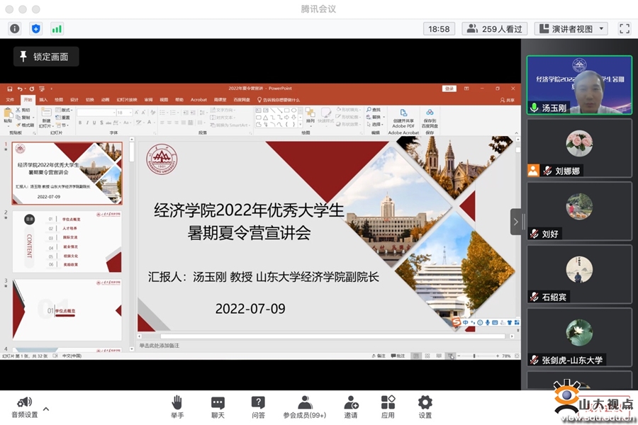 [本站讯]7月9日,山东大学经济学院2022年第十届全国优秀大学生夏令营开营仪式在线上举行,山东大学研究生院常务副院长刘国亮,山东大学讲席教授、经济学院院长林平出席开营仪式并致辞,开营仪式由经济学院常务副院长石绍宾主持。