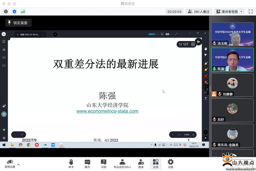 学术讲座环节,山东大学经济学院教授、博士生导师陈强作了题为“双重差分法的最新进展”的报告,他从随机试验的概念引出差分估计量,循序渐进地介绍了双重差分法的原理与推导过程。随后,陈强教授介绍了三重差分法,倾向得分匹配双重差分法以及合成双重差分法三种方法以应对非平行趋势检验。陈强教授进一步介绍了经典DID的拓展,例如广义DID和Cohort DID等等。陈强教授的报告深入浅出,图形与案例结合,内容翔实,各位营员收获颇丰。