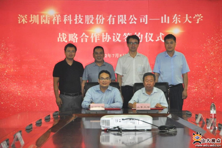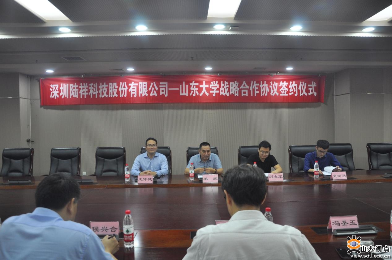 [本站讯]7月8日上午,山东大学与深圳陆祥科技股份有限公司战略合作签约仪式在中心校区举行。山东大学科学技术研究院院长周传健主持会议,深圳陆祥科技股份有限公司董事长羊辉、山东大学化学与化工学院党委书记侯兴合出席会议并致辞。