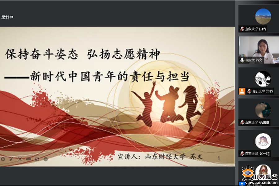 宣讲交流环节分为两个篇章。上篇以“追忆往昔峥嵘岁月——欲知大道 必先为史”为主题,五所高校宣讲团成员代表围绕党领导下中国青年走过的伟大历史进程展开精彩宣讲。中国海洋大学工程学院刘佳安以“回顾建团百年 争做先锋分子”为题,梳理共青团走过的百年奋斗历程与辉煌成就,展现一代代青年厚植爱国情怀、以奋进力量争做先锋力量的风采;山东农业大学外国语学院李一博以“百年党史 共忆荣光”为题,回顾党带领中国人民从站起来、富起来到强起来的光辉历程和历史性贡献,号召当代青年人继续书写时代华章;山东艺术学院艺术管理学院崔紫琦以“百年风华 从美术作品中看百年党史”为题,通过一幅幅画作生动展现百年间的风雨历程与深刻思想,以美育人、以美化人,推动党史学习教育深入人心;山东师范大学新闻与传媒学院张怡博以“百年风雨有相如”为题,回顾党领导下中国共青团走过的百年历程,展现不同时代中青春的一脉相承;济南大学文化和旅游学院张一鸣以“奋斗百年路,启航新征程”为题,从百年奋斗党史中汲取奋进新时代的信念和力量,阐释青年党员如何坚守初心、践行使命。上篇宣讲结束后,学生代表从宣讲内容与自身经历等方面发言,参与交流讨论。