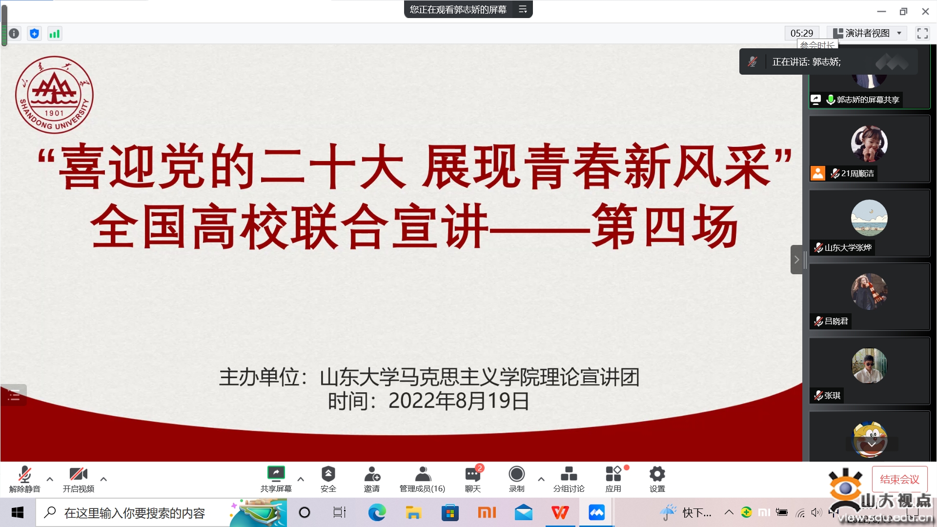 [本站讯]为认真学习贯彻习近平新时代中国特色社会主义思想,引导青年把握党的路线方针政策,进而激励广大青年勇毅前行、团结奋斗,近日,山东大学马克思主义学院理论宣讲团以“喜迎党的二十大,展现青春新风采”为主题,联合来自南京大学、吉林大学、大连理工大学、中国海洋大学、兰州大学的理论宣讲团开展四场暑期联学宣讲活动。