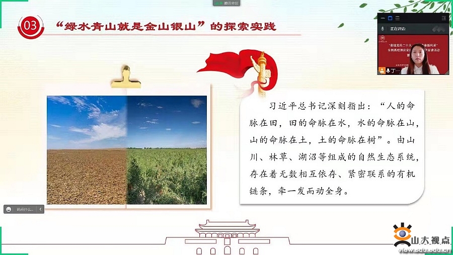 8月17日,暑期联学宣讲活动第二场——山东大学马克思主义学院理论宣讲团与吉林大学博士生讲师团的联合宣讲举行。理论宣讲团的崔琦悦、王星涵、牟茜雅以“让文化生根,用精神聚魂——党的十八大以来我国文化建设的主要成就”为题,分别从历史渊源、理论基础和实践经历三个方面进行宣讲。吉林大学博士生讲师团副团长宁新杰以“新时代党和国家事业发展的定海神针”为题,从历史、现实、实践三个维度阐述了坚持党的全面领导的重要性,论证了坚持和完善党的领导制度体系是实现中国梦的重要保障。讲师团成员丁一以“这十年,我们如何打造绿水青山”为题开展宣讲。