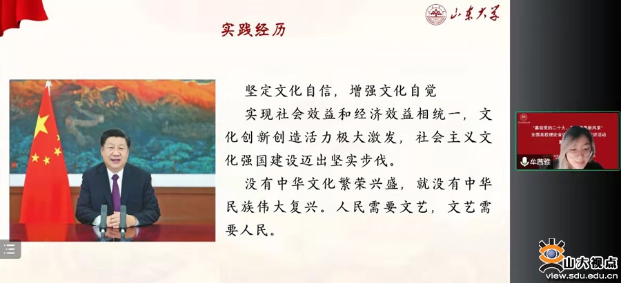 8月19日,暑期联学宣讲活动第四场——山东大学马克思主义学院理论宣讲团与大连理工大学马克思主义学院“星火计划”研究生宣讲团的联合宣讲举行。理论宣讲团的周顺洁以“论党的青年工作”为依托,就新时代的青年应如何贡献青春力量、以青春之我献礼党的二十大展开宣讲;刘文硕以“新时代取得的历史性成就与变革中蕴含的斗争精神”为题进行宣讲,对伟大斗争精神的内涵、如何发扬伟大斗争精神进行了阐释。大连理工大学马克思主义学院“星火计划”研究生宣讲团成员赵璐以“新时代的中国青年白皮书”为依托,对中国青年的品质进行了详细阐释,呼吁广大青年要增强做中国人的志气、骨气、底气,为祖国建设添砖加瓦;陈美娟就中国共产党开辟中国道路的历史进程及基本经验进行了精彩宣讲。