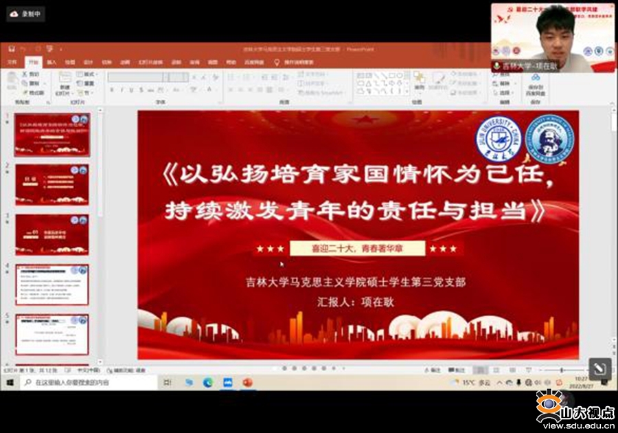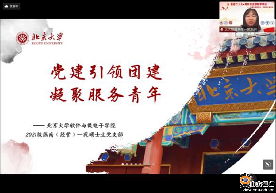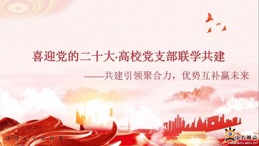 [本站讯]为迎接党的二十大胜利召开,进一步增强高校研究生党支部间的交流,激发基层党组织工作活力,更好地发挥党组织战斗堡垒和党员先锋模范作用,8月27日上午,山东大学马克思主义学院举办研究生党支部“喜迎党的二十大·高校党支部联学共建”活动,邀请了北京大学软件与微电子学院、清华大学深圳国际研究生院、吉林大学马克思主义学院、天津大学建筑工程学院、东北师范大学马克思主义学部等单位研究生党支部以及北京大学软件与微电子学院研究生会共同开展联学共建。
